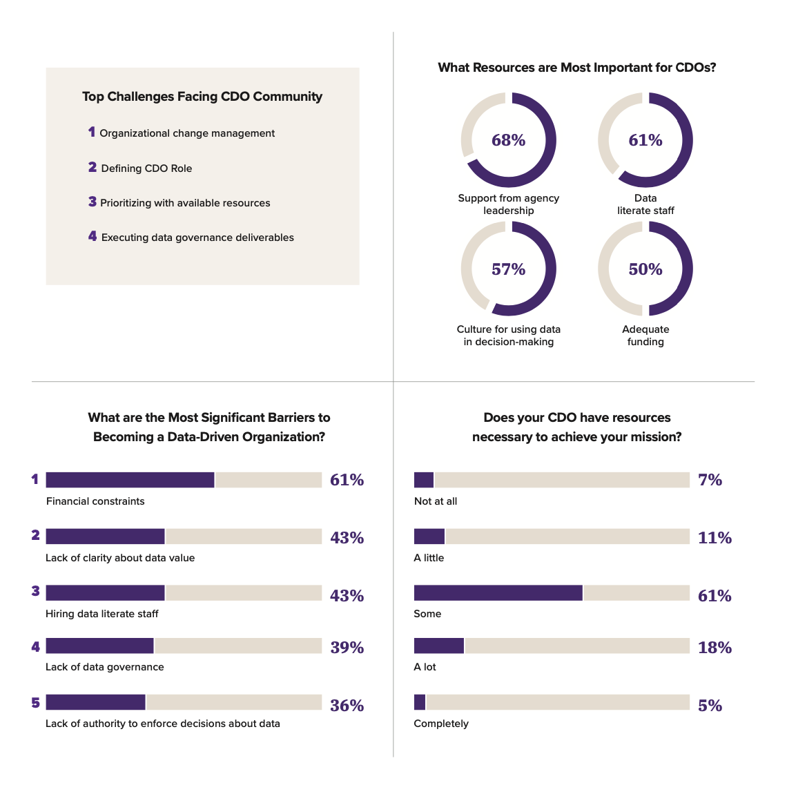 Challenges and barriers remain. Even as CDOs make progress on core obligations, they note challenges to meeting individual responsibilities and community expectations. Three-in-five CDOs cite financial and budgetary constraints as significant barriers to promoting data-driven government; half perceive challenges clearly defining the CDO role in government.